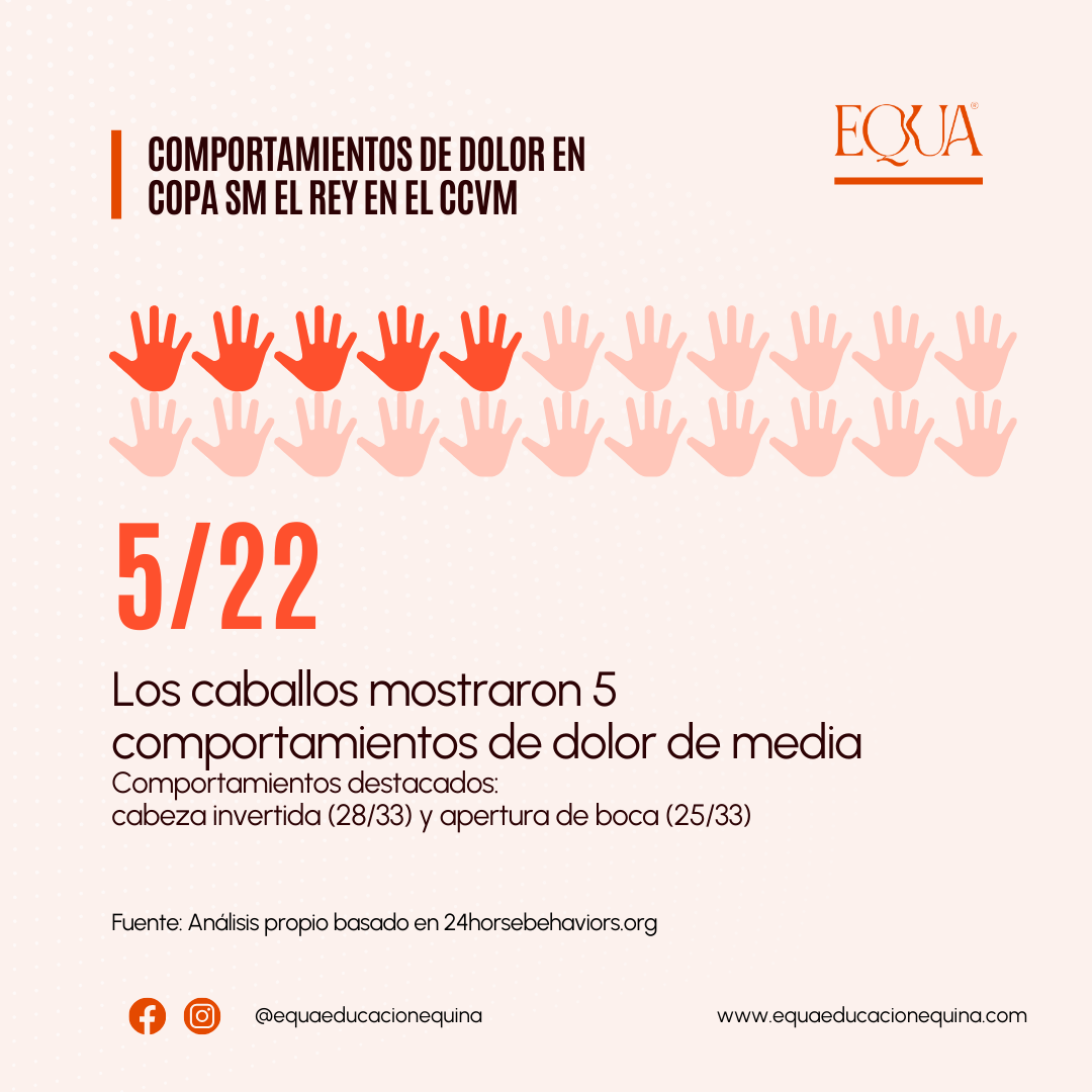 La yegua ganadora de la prueba mostró 9 comportamientos de dolor y, si soy sincera, creo que el mismo caballo, con un jinete más suave en su contacto, habría mostrado menos signos de dolor. Hubiese preferido que ganase la amazona que quedó en segunda posición, su yegua mostró a penas dos comportamientos de dolor.