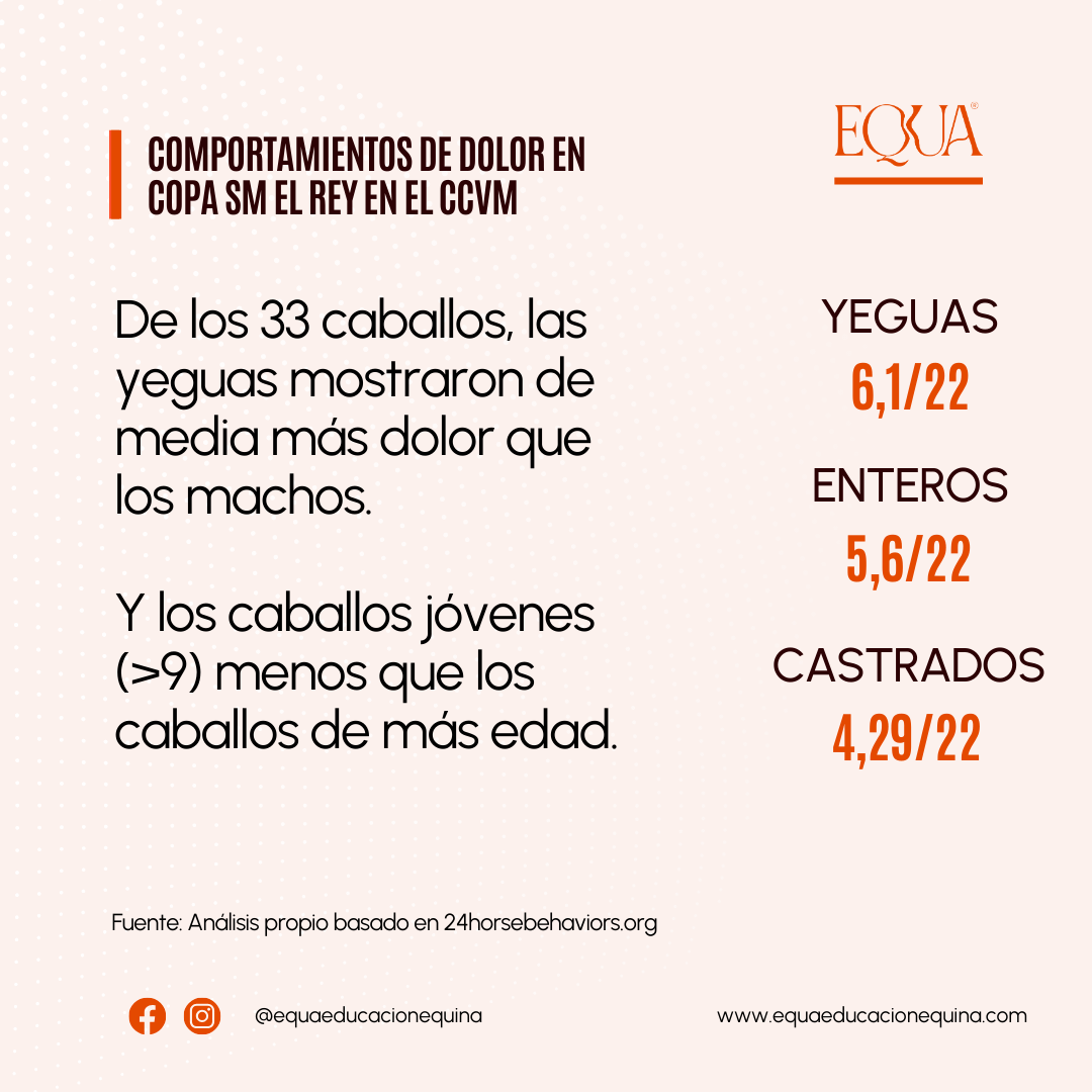 Los caballos que participaron tenían en su mayoría entre 10 y 11 años y estos mostraron 4,5 comportamientos de dolor de media. Los más jóvenes, fueron los cinco caballos de 9 años, su media era de 3,8 comportamientos de dolor. Esto puede indicarnos que la edad y la experiencia deportiva, como en los atletas de otras disciplinas, castiga el cuerpo y aumenta el número de comportamientos de dolor.