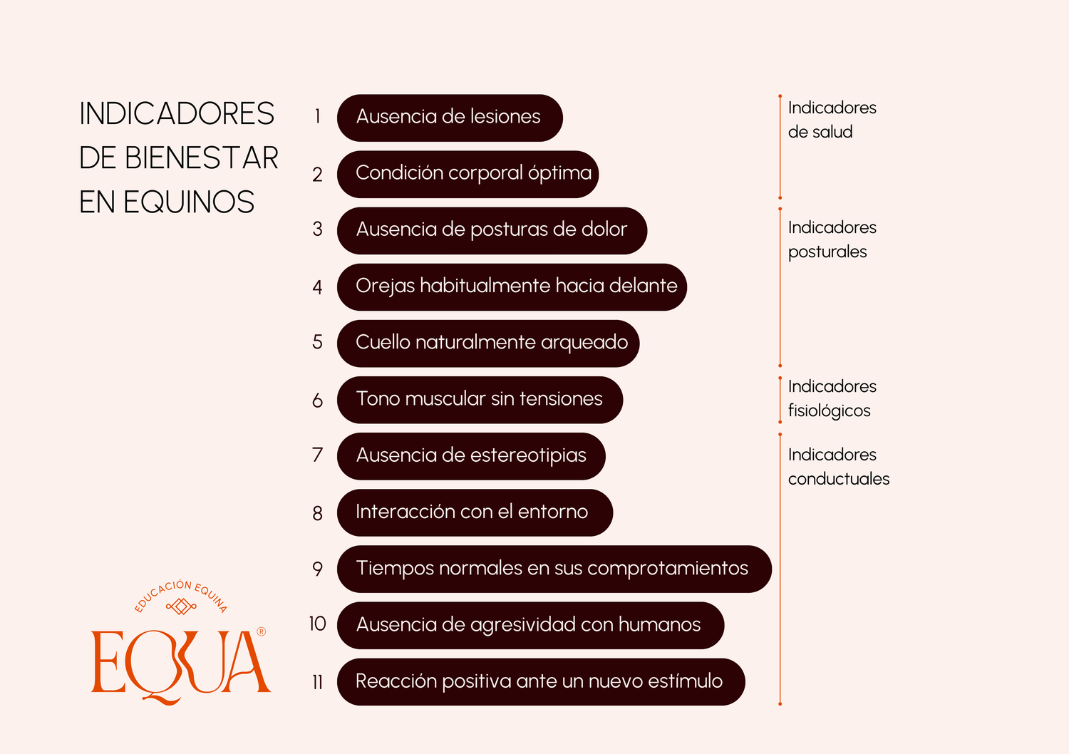 La buena noticia es que sí hay indicadores concretos. Un estudio publicado en febrero de 2020 recopiló señales de bienestar equino y las organizó en categorías: indicadores de salud, posturales, fisiológicos y conductuales. Aquí va un resumen:
